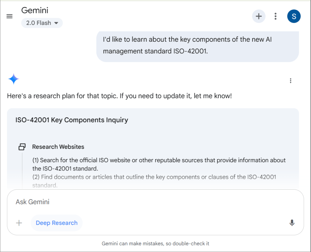 - Gemini Deep Research will first produce a research plan which you can edit and then accept. This research plan will guide how the AI approaches its research.